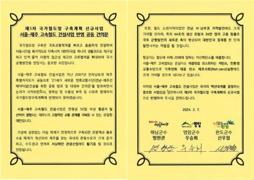 Áö³ ¿Ïµµ¡¤Çس²¡¤¿µ¾Ï ±º¼ö´Â °øµ¿ °ÇÀǹ®À» Áö³ 2¿ù 7ÀÏ, ¡®¿Ïµµ °æÀ¯ ¼¿ï~Á¦ÁÖ °í¼Óöµµ °Ç¼³ »ç¾÷¡¯ °øµ¿ °ÇÀǹ®À» Àü³²µµ¿¡ Á¦ÃâÇß´Ù.