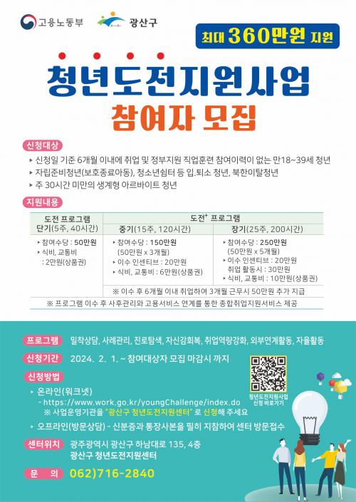 [½Åµ¿¾Æ¹æ¼Û=±èÀçÂù±âÀÚ] ±¤ÁÖ ±¤»ê±¸(±¸Ã»Àå ¹Úº´±Ô)´Â û³âÀÇ ³ëµ¿½ÃÀå Âü¿©¿Í Ãë¾÷À» Áö¿øÇÏ´Â °í¿ë³ëµ¿ºÎ ÁÖ°ü ¡®2024³â û³âµµÀü Áö¿ø»ç¾÷¡¯¿¡ 2³â ¿¬¼Ó ¼±Á¤µÅ ±¹ºñ 10¾ï 400¸¸ ¿øÀ» È®º¸Çß´Ù°í ¹àÇû´Ù.