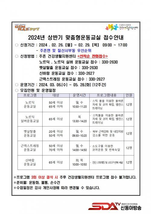 3¿ù 6ÀÏ(¼ö)ºÎÅÍ 5¿ù 28ÀÏ(È)±îÁö ÁøÇàµÇ´Â ¿îµ¿±³½ÇÀº 5°³ ¹ÝÀ¸·Î ÃÑ 60¸íÀ» ¸ðÁýÇÏ¿© 12ÁÖ°£ ¿î¿µµÇ¸ç, 20¼¼ ÀÌ»ó ¼ºÀκÎÅÍ 65¼¼ÀÌ»ó ³ëÀαîÁö ´Ù¾çÇÑ ¿¬·É´ë¸¦ ´ë»óÀ¸·Î ³ë¸£µñ ¿îµ¿, ¹î»ìÅ»Ã⠿, ½Å¹Ù¶÷ ¿îµ¿±³½Ç µî ´Ùä·Ó°í ü°èÀûÀÎ ÇÁ·Î±×·¥À¸·Î ±¸¼ºµÇ¾î ÀÖ´Ù.