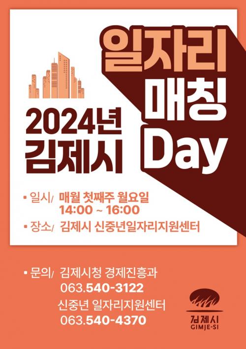 ¿À´Â 3¿ù 4ÀÏ ¿ÀÈÄ 2½ÃºÎÅÍ 4½Ã±îÁö ±èÁ¦ ½ÅÁß³â ÀÏÀÚ¸®Áö¿ø¼¾ÅÍ¿¡¼ ÀÏÀÚ¸® ¸Åε¥À̰¡ ¿¹Á¤µÅ ÀÖÀ¸¸ç, ¿À´Â 12¿ù±îÁö ¸Å¿ù ù°ÁÖ ¿ù¿äÀÏ¿¡ ÀÏÀÚ¸® ¸Åε¥À̸¦ ÁøÇàÇÒ ¿¹Á¤ÀÌ´Ù.