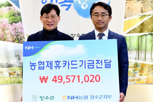 ¡®Á¦ÈÞÄ«µå Àû¸³±â±Ý¡¯Àº NH³óÇùÀºÇà°ú Àå¼ö±º °£ °øµ¿ Çù¾à¿¡ µû¶ó Áö³ÇØ 1³â°£ Àå¼ö±ºÃ» ¹ýÀÎÄ«µå, °ø¹«¿ø º¹ÁöÄ«µå¿Í º¸Á¶±Ý Àü¿ëÄ«µå »ç¿ë¾×ÀÇ 0.2~1.0%¸¦ Àå¼ö±º ¹ßÀü ±â±ÝÀ¸·Î Àû¸³ÇÑ °ÍÀ¸·Î 49,571,020¿øÀ» Àü´ÞÇß´Ù.
