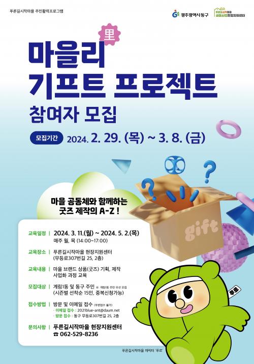 ±³À° ÀÏÁ¤Àº ¿À´Â 11ÀϺÎÅÍ ¸ÅÁÖ ¿ù¡¤¸ñ¿äÀÏ ¿ÀÈÄ 2½Ã Ǫ¸¥±æ½ÃÀÛ¸¶À» ÇöÀåÁö¿ø¼¾ÅÍ¿¡¼ ¸¶À»°øµ¿Ã¼¿Í ºê·£µå »óǰ ±³À°À» ½ÃÀÛÀ¸·Î ¸¶À» ÄÜÅÙÃ÷ Á¦Ç°À» Á÷Á¢ Á¦ÀÛÇϰí À̸¦ ¹ßÀü½ÃÄÑ È«º¸ÇÏ´Â °úÁ¤À¸·Î ¿î¿µµÈ´Ù.