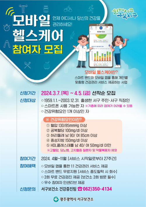 [½Åµ¿¾Æ¹æ¼Û=ÀÌÁöÇö±âÀÚ] ±¤ÁÖ±¤¿ª½Ã ¼­±¸(±¸Ã»Àå ±èÀ̰­)´Â Áö¿ªÁÖ¹ÎÀÇ °Ç°­¼öÁØ Çâ»óÀ» À§ÇØ ICT ±â¼úÀ» Ȱ¿ëÇÑ °Ç°­°ü¸®¼­ºñ½º ¡®¸ð¹ÙÀÏ ÇコÄÉ¾î »ç¾÷¡¯´ë»óÀÚ¸¦ ³»´Þ 5ÀϱîÁö ¼±Âø¼ø 170¸í ¸ðÁýÇÑ´Ù.