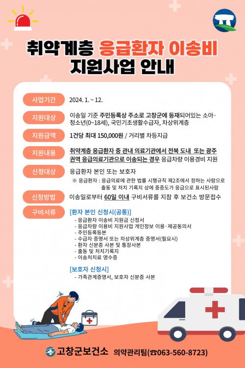 Áö¿ø´ë»óÀº ¼Ò¾Æ¡¤Ã»¼Ò³â(0~18¼¼)°ú ±¹¹Î±âÃÊ»ýȰ¼ö±ÞÀÚ, Â÷»óÀ§ °èÃþÀÌ ÇØ´çµÈ´Ù. ÀÀ±ÞȯÀÚ·Î °íâÁö¿ª ÀÇ·á±â°ü¿¡¼­ ÀüºÏ µµ³» ¹× ±¤Áֱǿª ÀÀ±ÞÀÇ·á±â°üÀ¸·Î ÀÌ¼ÛµÈ °æ¿ì, ÀÀ±ÞÂ÷·® ÀÌ¿ë°æºñ¸¦ Áö¿øÇÑ´Ù.