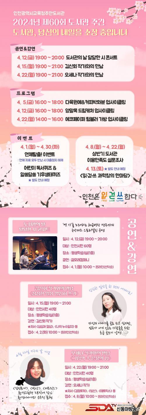 ÁÖ¿ä Çà»ç´Â 4¿ù 12ÀÏ µµ¼­°üÀÇ ³¯ ¡®´Þ´ÞÇÑ ½Ã Äܼ­Æ®¡¯¸¦ ÅëÇØ ¡®¿¾ ½Ã¡¯¸¦ ³ë·¡ÇÏ´Â ±¹¾ÇÀçÁî °ø¿¬,4¿ù 15ÀÏ ¿¡¼¼ÀÌ ÀÛ°¡ ±è½ÅȸÀÇ ±Û¾²±â °­¿¬,4¿ù 22ÀÏ Áö±¸ÀÇ ³¯ ±â³ä ȯ°æ±×¸²Ã¥À» ÁÖÁ¦·Î ÇÑ ¿À¼¼³ª ÀÛ°¡ °­¿¬ µîÀÌ´Ù.
