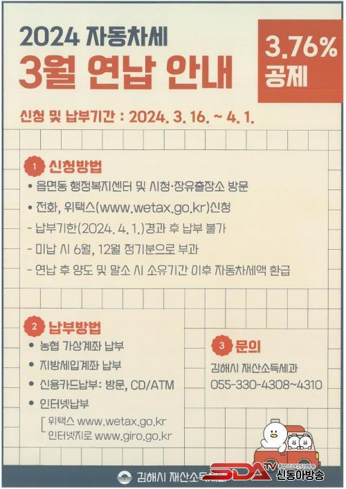 3¿ù ÀÚµ¿Â÷¼¼¸¦ ¿¬³³Çϸé 1³â ¼¼¾×ÀÇ ¾à 3.76%¸¦ °øÁ¦¹ÞÀ» ¼ö ÀÖÀ¸¸ç, 4¿ù 1ÀϱîÁö ¿¬³³À¸·Î ³³ºÎÇÏÁö ¾ÊÀ¸¸é 6¿ù Á¤±âºÐ ³³¼¼°íÁö¼¸¦ ¹Þ°í ³³ºÎÇÏ¸é µÈ´Ù.
