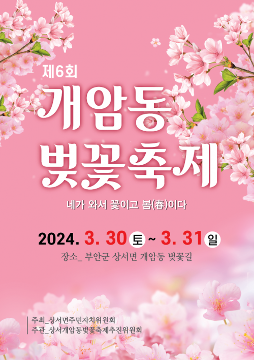 [½Åµ¿¾Æ¹æ¼Û=À¯¸íÁø±âÀÚ] ºÎ¾È±ºÀÇ ´ëÇ¥ º½²É ÃàÁ¦ÀÎ Á¦6ȸ °³¾Ïµ¿ º¢²ÉÃàÁ¦°¡ ¿À´Â 3¿ù 30ÀÏ(Åä)~ 3¿ù 31ÀÏ(ÀÏ) 2Àϰ£ »ó¼­¸é °³¾Ïµ¿ º¢²É±æ¿¡¼­ °³ÃֵȴÙ.