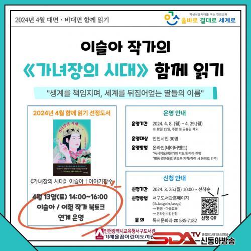4¿ù ÇÔ²² Àб⠼±Á¤µµ¼´Â À̽½¾Æ ÀÛ°¡ÀÇ º£½ºÆ®¼¿·¯ ¼Ò¼³ ¡®°¡³àÀåÀÇ ½Ã´ë¡¯·Î Âü¿©ÀÚµéÀº 4¿ù 8ÀϺÎÅÍ 29ÀϱîÁö Àбâ ÁøµµÇ¥¿¡ µû¶ó µµ¼¸¦ ÇÔ²² ÀÐ°í »ý°¢°ú ´À³¦À» °øÀ¯ÇÑ´Ù. µ¶¼Àü¹®°¡ÀÇ Áöµµ¿¡ µû¶ó ÁøÇàÇϸç, 4¿ù 13ÀÏ¿¡´Â À̽½¾Æ‧ÀÌÈÍ ÀÛ°¡ÀÇ ºÏÅäÅ©¸¦ °³ÃÖÇÑ´Ù.