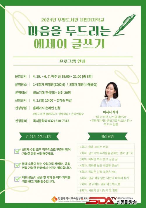 ¡®¸¶À½À» µÎµå¸®´Â ¿¡¼¼ÀÌ ±Û¾²±â¡¯´Â ¸ÅÀÏ ²ÙÁØÈ÷ ±ÛÀ» ¾µ ¼ö ÀÖµµ·Ï Áö¿øÇÏ´Â ÇÁ·Î±×·¥À¸·Î 4¿ù 19ÀϺÎÅÍ 6¿ù 7ÀϱîÁö ÃÑ 8ȸ ÁøÇàÇϸç, 1ȸºÎÅÍ 7ȸ±îÁö´Â ÁÜÀ» Ȱ¿ëÇÑ ¿Â¶óÀÎ ¼ö¾÷À¸·Î, 8ȸÂ÷´Â ¼·ÎÀÇ ±ÛÀ» ³ª´©¸ç °øÀ¯ÇÏ´Â ´ë¸é ¼ö¾÷À¸·Î ¿î¿µµÈ´Ù.