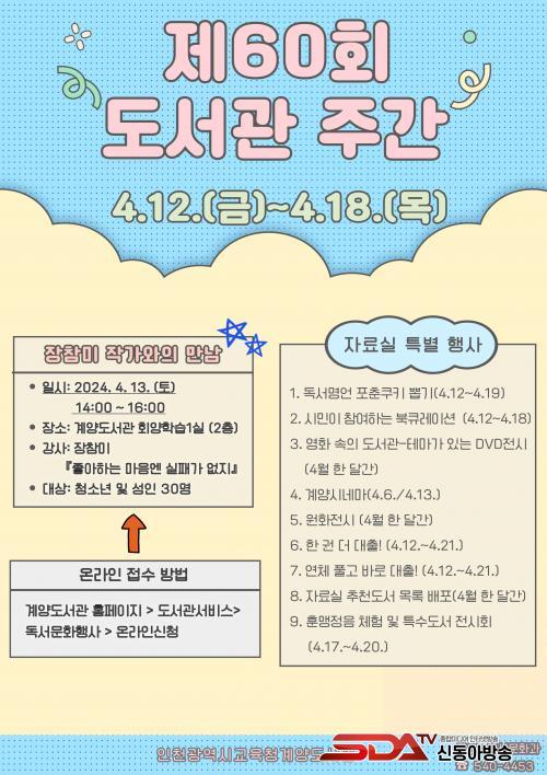 [½Åµ¿¾Æ¹æ¼Û ÀÎõ=À±¹Î½Ä±âÀÚ]ÀÎõ±¤¿ª½Ã±³À°Ã» ¼­±¸µµ¼­°ü(°üÀå ¹ÚÁ¤Èñ)°ú °è¾çµµ¼­°ü(°üÀå ¿ÀÅÂȯ)Àº Á¦60ȸ µµ¼­°ü ÁÖ°£(4.12~4.18.)°ú Á¦2ȸ µµ¼­°üÀÇ ³¯(4.12.)À» ¸Â¾Æ ¡®µµ¼­°ü, ´ç½ÅÀÇ ³»ÀÏÀ» ¼ÒÀå ÁßÀÔ´Ï´Ù¡¯¸¦ ÁÖÁ¦·Î ´Ùä·Î¿î Çà»ç¸¦ ¿î¿µÇÑ´Ù.