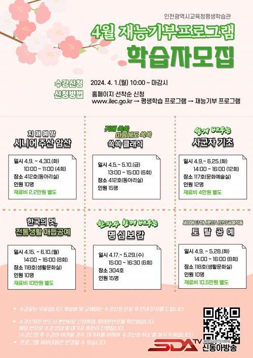 4¿ù ¿î¿µ ÇÁ·Î±×·¥Àº ÅäÅ»°ø¿¹, Çѱ¹ÀÇ ¸Ú, ÀüÅë»ýȰ ¸Åµì°ø¿¹, ±Í¿¡ ½ï½ï ¸¶À½¿¡µµ ½ï½ï, ½ï½ï Ŭ·¡½Ä, ½Ã´Ï¾î ÁÖ»ê¾Ï»ê, ½±°Ô ¹è¿ì´Â »ç±ºÀÚ ±âÃÊ, ÇÑÀÚ¿Í ÇÔ²² ¹è¿ì´Â ¸í½Éº¸°¨ µî 6°³´Ù.