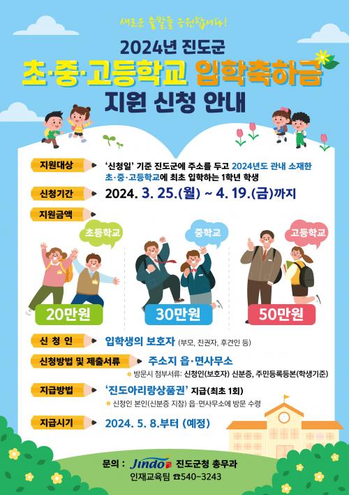 Áö¿ø´ë»óÀº ½ÅûÀÏ ±âÁØ Áøµµ±º¿¡ ÁÖ¼Ò¸¦ µÎ°í °ü³» ¼ÒÀçÇÑ ÃÊ‧Áß‧°íµîÇб³¿¡ ÃÖÃÊ ÀÔÇÐÇÏ´Â 1Çгâ ÇлýÀ¸·Î ¡ãÃʵîÇб³ 20¸¸¿ø ¡ãÁßÇб³ 30¸¸¿ø ¡ã°íµîÇб³ 50¸¸¿øÀ» Áö¿øÇÑ´Ù.