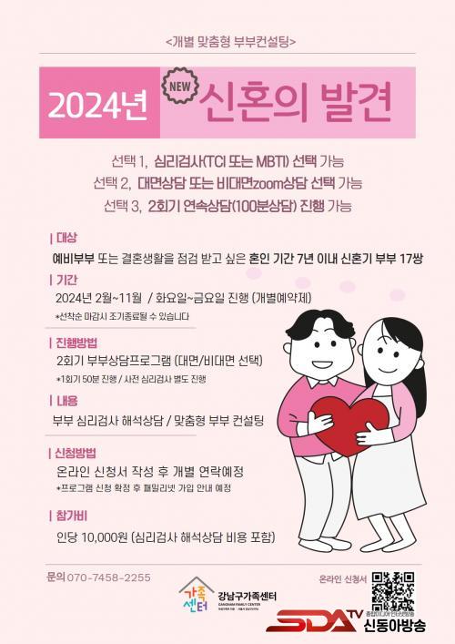 ƯÈ÷ °¡Á· »ó´ã Æ¯È »ç¾÷À¸·Î Áö³ÇØ Ã³À½ ½Ç½ÃÇØ 37½ÖÀÇ ºÎºÎ°¡ Âü¿©ÇÑ ¡®½ÅÈ¥ÀÇ ¹ß°ß¡¯À» È®´ë ¿î¿µÇÑ´Ù. ¿¹ºñºÎºÎ ¹× È¥ÀÎ ±â°£ 7³â À̳»ÀÇ ½ÅÈ¥±â ºÎºÎ¸¦ ´ë»óÀ¸·Î °³Àκ° ¼º°Ý ¹× ±âÁú °Ë»ç ½Ç½Ã ÈÄ, 1ȸ 50ºÐ¾¿ ÃÑ 2ȸ¿¡ °ÉÃÄ ¸ÂÃãÇü »ó´ãÀ» Á¦°øÇÑ´Ù. ¿ÃÇØ¿¡´Â ±âÁ¸ Âü¿©ÀÚÀÇ ÀǰßÀ» ¹Ý¿µÇØ ¼º°Ý ¹× ±âÁú »çÀü°Ë»ç¿¡ ±âÁ¸ TCI °Ë»ç¿¡¼ MBTI °Ë»ç¸¦ Ãß°¡Çß°í »ó´ã¹æ½Äµµ ´ë¸é°ú ºñ´ë¸é Áß ¼±ÅÃÇÒ ¼ö ÀÖµµ·Ï Çß´Ù. Âü¿©ÀÚ°¡ ¿øÇÒ ½Ã 100ºÐ µ¿¾È 2ȸ±â ¿¬¼Ó»ó´ãµµ °¡´ÉÇÏ´Ù. ½ÅûÀº ¼±Âø¼øÀ¸·Î ¸ðÁýÇϰí Âü°¡ºñ´Â Àδç 10,000¿øÀÌ´Ù. À̹ۿ¡ ´Ù¾çÇÑ °¡Á· ÇÁ·Î±×·¥¿¡ Âü¿©¸¦ ¿øÇÏ´Â »ç¶÷Àº ¼¾ÅÍ È¨ÆäÀÌÁö¿¡ ¹æ¹®Çϰųª ÀüÈ ¹®ÀÇ(¢Ï02-3412-2222)ÇÏ¸é µÈ´Ù.