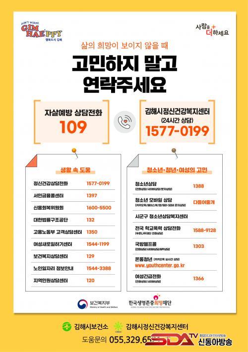 ÇÑÆí ¿ì¿ï°¨ µî ¸»Çϱ⠾î·Á¿î °í¹ÎÀÌ Àְųª ÁÖº¯¿¡ ÀÌ·± ¾î·Á¿òÀ» °Þ´Â °¡Á·¡¤ÁöÀÎÀÌ ÀÖÀ» °æ¿ì Àڻ쿹¹æ»ó´ã ÀüÈ ¢Ï109, Á¤½Å°Ç° »ó´ãÀüÈ ¢Ï1577-0199, Èñ¸ÁÀÇ ÀüÈ ¢Ï129, û¼Ò³â »ó´ã ¢Ï1388·Î ¿¬¶ôÇϸé 24½Ã°£ Àü¹®°¡ »ó´ãÀ» ¹ÞÀ» ¼ö ÀÖ´Ù. ÁÖ°£Àº ±èÇØ½ÃÁ¤½Å°Ç°º¹Áö¼¾ÅÍ(055-329-6521~5)·Î ¿¬¶ôÇÏ¸é µÈ´Ù.