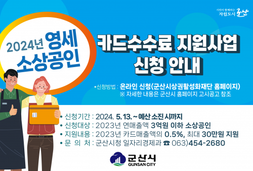 ¿µ¼¼¼Ò»ó°øÀÎ Ä«µå¼ö¼ö·á Áö¿ø»ç¾÷Àº 2024³â ÃÑ»ç¾÷ºñ 11¾ï 5õ6¹é¸¸¿øÀ¸·Î, 2023³â ¿¬¸ÅÃâ 3¾ï¿ø ÀÌÇÏ ¿µ¼¼ ¼Ò»ó°øÀÎÀ» ´ë»óÀ¸·Î Ä«µå ¸ÅÃâ¾×ÀÇ 0.5%¿¡ ÇØ´çµÇ´Â Ä«µå¼ö¼ö·á¸¦ ÃÖ´ë 30¸¸¿ø±îÁö Áö¿øÇÏ´Â ³»¿ëÀ» ´ã°í ÀÖ´Ù.