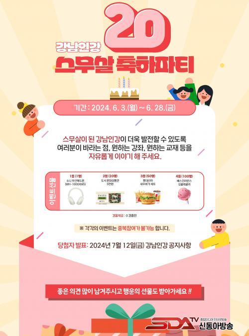 [½Åµ¿¾Æ¹æ¼Û °­³²±¸=À̽ŵ¿±âÀÚ]°­³²±¸°¡ ¿î¿µÇÏ´Â °­³²±¸Ã»ÀÎÅͳݼö´É¹æ¼Û(ÀÌÇÏ °­³²Àΰ­)ÀÌ 20ÁÖ³âÀ» ¸Â¾Æ 6¿ù ÇÑ ´Þ°£ ÃàÇÏ À̺¥Æ®¸¦ °³ÃÖÇÑ´Ù. °­³²Àΰ­ ½º¹«»ì ÃàÇÏÆÄÆ¼ 20ÁÖ³â Æ¯º° °¡ÀÔ À̺¥Æ®, ¸ÞŸ¹ö½º À̺¥Æ® µî 3°³ À̺¥Æ®¸¦ µ¿½Ã ÁøÇàÇϰí ǪÁüÇÑ °æÇ°À» Á¦°øÇÑ´Ù.