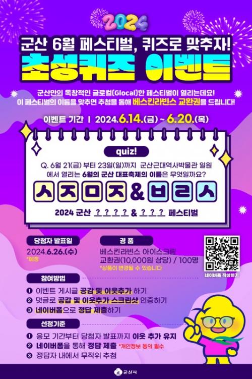 À̹ø À̺¥Æ®´Â ¡®±º»ê 6¿ù ´ëÇ¥ Æä½ºÆ¼¹ú, ÄûÁî·Î ¸ÂÃßÀÚ! ÃʼºÄûÁî À̺¥Æ®¡¯·Î 6¿ù 21ÀϺÎÅÍ 23ÀϱîÁö 3Àϰ£ ±Ù´ë¿ª»ç¹Ú¹°°ü ÀÏ¿ø¿¡¼ ¿¸®´Â ÃàÁ¦ À̸§À» ¸ÂÃß¸é µÈ´Ù.