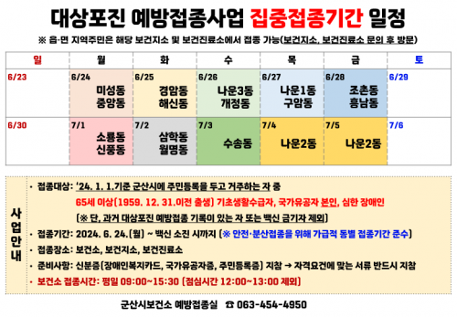 [½Åµ¿¾Æ¹æ¼Û=À̺´½Ä±âÀÚ] ±º»ê½Ãº¸°Ç¼Ò°¡ 6¿ù 24ÀϺÎÅÍ 65¼¼ ÀÌ»ó Ãë¾à°èÃþÀ» ´ë»óÀ¸·Î ´ë»óÆ÷Áø ¹«·á ¿¹¹æÁ¢Á¾À» ½Ç½ÃÇÑ´Ù.
