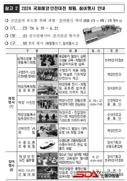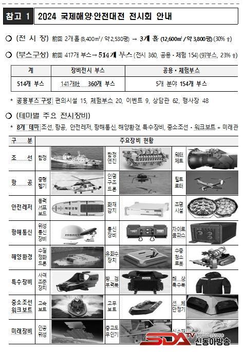 ƯÈ÷, ¿ÃÇØ Àü½Ãȸ´Â Á¶¼±, Ç×°ø, ¾ÈÀü¡¤·¹Àú, Ç×ÇØÅë½ÅÀåºñ, Ư¼öÀåºñ, ÇØ¾çȯ°æ, Áß¼ÒÁ¶¼±¡¤¿öÅ©º¸Æ®, ¹Ì·¡°ü ÁÖÁ¦·Î ±¸¼ºµÈ Å׸¶°üÀ¸·Î ´Ù¾çÇÑ Àåºñ¸¦ Àü½ÃÇÑ´Ù. À̹ۿ¡µµ ±¹¹ÎµéÀÌ Âü¿©ÇÒ ¼ö ÀÖ´Â ÇÁ·Î±×·¥ÀÎ Ãë¾÷¼³¸íȸ, ÇØ¾ç°æÂû Á¦º¹ ¹× ±¸¸íÁ¶³¢ Âø¿ë, ½ÉÆó¼Ò»ý¼ú üÇè, ¼±¹Ú¾ÈÀü VR üÇè µîÀ» ¿î¿µÇϸç, ¿ÃÇØ ÃÖÃÊ·Î °ÀÎÇÑ Ã¼·Â°ú °Ç°ÇÑ ½Åü¸¦ °¡Áö°í ±¹¹ÎÀÇ »ý¸íÀ» ÁöŰ´Â ÇØ¾ç°æÂû°üÀ» ¼±¹ßÇÏ´Â ¡®¹Ù´Ù»ç³ªÀÌ ¼±¹ß´ëȸ¡¯¿Í 6³â ¸¸¿¡ °³ÃÖÇϴ û¼Ò³âÀ» À§ÇÑ ¡°Çؾç¾ÈÀü µµÀü°ñµçº§¡± µî ±¹¹Îµé¿¡°Ô ´Ù¾çÇÑ º¼°Å¸®, Âü¿© °Å¸®¸¦ Á¦°øÇÑ´Ù.