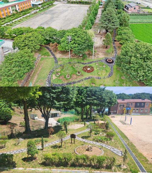 ÀÓ½ÇÃʵîÇб³¿¡´Â ²É»ç°ú, ÆÏ¹è³ª¹«, »êµþ³ª¹«, Àº¸ñ¼, ²É¹«¸©, ¼ö¼±È µî ±³‧°ü¸ñ ¹× ÃÊÈ·ù¸¦ ½ÄÀçÇÏ¿© ÇлýµéÀÌ ½£¼Ó¿¡¼ ½Ä¹°À» °üÂûÇϰí, ÀÚ¿¬À» ü°¨ÇÒ ¼ö ÀÖ´Â ¾Æ¸§´Ù¿î °ø°£À» Á¶¼ºÇß´Ù.