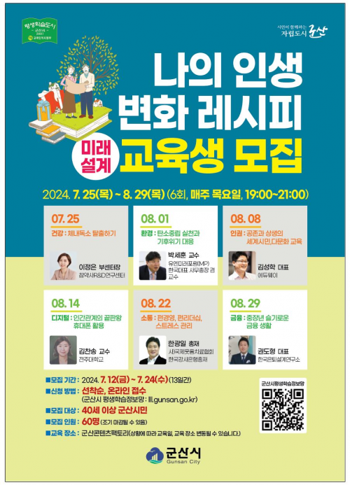 ±³À° ´ë»óÀº 40¼¼ ÀÌ»ó ±º»ê½Ã¹ÎÀÌ¸é ´©±¸³ª Âü¿© °¡´ÉÇϸç, ¼ö°À» ¿øÇÏ´Â ½Ã¹ÎÀº 7¿ù 24ÀϱîÁö ±º»ê½ÃÆò»ýÇнÀÁ¤º¸¸Á¿¡ Á¢¼ÓÇÏ¿© ½ÅûÇÏ¸é µÈ´Ù.