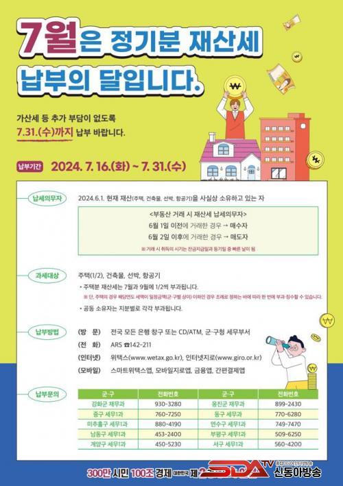 Àç»ê¼¼ ³³ºÎ ±â°£Àº 7¿ù 31ÀÏÀ̸ç, ÀºÇà¿¡ Á÷Á¢ ¹æ¹®ÇÏ¿© ³³ºÎÇØµµ µÇÁö¸¸ Áö¹æ¼¼³³ºÎ½Ã½ºÅÛÀÎ À§Åýº(www.wetax.go.kr), ¿Â¶óÀÎ °èÁÂÀÌü, ½º¸¶Æ®Æù ¾Û(½º¸¶Æ® À§Åýº) ¹× ARS(ÅÚ·¹¹ðÅ·)·Î ³³ºÎÇÏ¸é °øÈÞÀϰú ¾ß°£¿¡µµ Æí¸®ÇÏ°Ô ³³ºÎÇÒ ¼ö ÀÖ´Ù. Àç»ê¼¼ °íÁö¼¸¦ ¹ÞÀº ÈÄ ±Ã±ÝÇÑ »çÇ×Àº ¼ÒÀ¯Çϰí ÀÖ´Â ¹°°ÇÀÇ ¼ÒÀçÁö ±º±¸ ¼¼¹«ºÎ¼¿¡ ¹®ÀÇÇϸé ÀÚ¼¼ÇÏ°Ô ¾È³»¹ÞÀ» ¼ö ÀÖ´Ù.