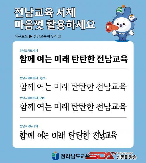 À̹ø¿¡ °³¹ßµÈ Àü³²±³À° Àü¿ë¼Ã¼´Â °íµñ °è¿(¶Ç¹Úü), ¸íÁ¶ °è¿(¹Ù¸¥Ã¼), ¼Õ±Û¾¾ °è¿(À¯³ªÃ¼) µî 3°¡Áö ŸÀÔÀÇ ±Û¾¾Ã¼ 4Á¾À̸ç ÇÑ±Û 2780ÀÚ, ¿µ¹® 94ÀÚ, Ư¼ö¹®ÀÚ 986ÀÚ·Î ±¸¼ºµÆ´Ù. ¡®¶Ç¹Úü¡¯´Â ±âÁ¸ ·Î°í¿¡ Çö´ëÀû °¨°¢À» ´õÇßÀ¸¸ç, ¡®¹Ù¸¥Ã¼¡¯´Â ³ë·ÂÀÇ ¹°¹æ¿ïµéÀÌ ¸ð¿© ¹Ì·¡¸¦ ¸¸µé¾î°¡´Â ¸ð½ÀÀ» Çü»óÈÇß´Ù. ¶Ç, ¡®À¯³ªÃ¼¡¯´Â Áö³ÇØ ´ë±¹¹Î ¼Õ±Û¾¾ °ø¸ðÀüÀ» ÅëÇØ ¼±Á¤µÈ ½ÇÁ¦ Çкθð ±Û¾¾Ã¼¶ó´Â Á¡¿¡¼ °øµ¿Ã¼ Âü¿©ÀÇ Àǹ̸¦ ´õÇÑ´Ù. ƯÈ÷, 3°¡Áö ŸÀÔ ¸ðµÎ µðÁöÅÐ ±³°ú¼ ½Ã´ë¿¡ ¹ß¸ÂÃç ¸ð¹ÙÀÏ ¹× À¥¿¡¼µµ ±ÛÀÚ°¡ ±ò²ûÇÏ°Ô Ç¥ÇöµÉ ¼ö ÀÖµµ·Ï ¿Â¶óÀΠȯ°æÄ£ÈÀûÀ¸·Î °³¹ßµÆ´Ù.