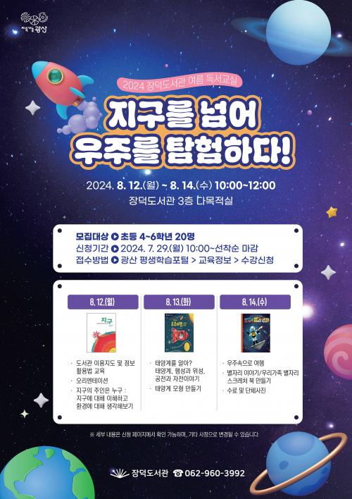 [½Åµ¿¾Æ¹æ¼Û=±èÀçÂù±âÀÚ] ±¤ÁÖ ±¤»ê±¸(±¸Ã»Àå ¹Úº´±Ô) Àå´öµµ¼­°üÀÌ 8¿ù 12ÀϺÎÅÍ 14ÀϱîÁö ÃʵîÇб³ 4~6ÇгâÀ» ´ë»óÀ¸·Î ¡®Áö±¸¸¦ ³Ñ¾î ¿ìÁÖÀÇ ¼¼°è¸¦ ŽÇèÇÏ´Ù¡¯ ¿©¸§ µ¶¼­ ±³½ÇÀ» ¿î¿µÇÑ´Ù.