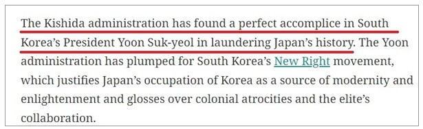 "ëÅÀº ±â½Ã´Ù°¡ ÀÚ±¹ ¿ª»ç¸¦ ¼¼Å¹ÇÏ´Â µ¥ ÀÖ¾î ¹ß°ßÇÑ ¿Ïº®ÇÑ °ø¹ü(The Kishida administration has found a perfect accomplice in South Korea's President Yoon Suk-yeol in laundering Japan's history)" À̶ó°í ²¿ÁýÀº °ÍÀ¸·Î,