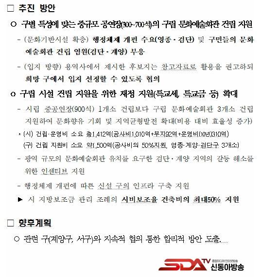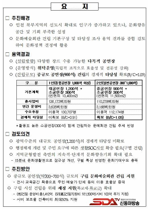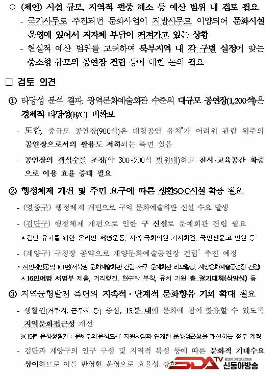 ÀÌ¿¡ µû¶ó ÀÎõ½Ã´Â Áß°ø¿¬Àå(900¼®) ±Ô¸ðÀÇ ¹®È­¿¹¼úȸ°üÀÌ Å¸´ç¼ºÀ» È®º¸ÇßÀ½À» È®ÀÎÇϰí, ¹®È­¿¹¼úÁøÈï¹ý ½ÃÇà·É¿¡ µû¸¥ ÀϹݰø¿¬ÀåÀ¸·Î ºÐ·ùµÈ ±¸¡¤±º ¹®È­¿¹¼úȸ°üÀ¸·Î °Ç¸³ ¹× ¿î¿µÇÏ´Â °ÍÀÌ ÀûÀýÇÏ´Ù°í ÆÇ´ÜÇß´Ù. ´Ù¸¸, ½Ã¿¡¼­ Á÷Á¢ °Ç¸³ÇÏ´Â °ÍÀÌ ¾Æ´Ñ, ¹®È­¿¹¼úȸ°üÀÌ ÇÊ¿äÇÑ ±¸(°è¾ç, °Ë´Ü, ¿µÁ¾)¿¡ ÃÖ´ë 50%±îÁö ÀçÁ¤ Áö¿øÀ» ÇÏ¿© ±¸º° ¼ö¿ä ¹× Ư¼º¿¡ ¸Â´Â ¹®È­¿¹¼úȸ°üÀ» °Ç¸³ÇÏ´Â °ÍÀÌ ÁֹεéÀÇ ¹®È­ ÇâÀ¯ ±âȸ È®´ë ¹× Áö¿ª ±ÕÇü ¹ßÀüÀ» µµ¸ðÇÒ ¼ö ÀÖÀ» °ÍÀ¸·Î ³»´ÙºÃ´Ù.