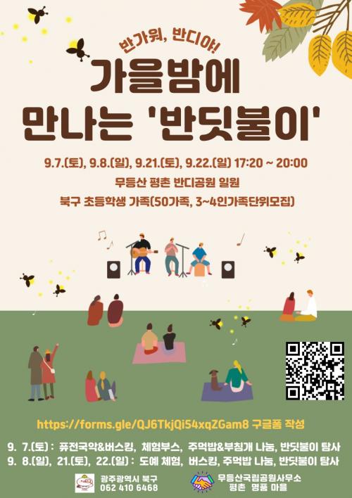 ¸ÕÀú °¡À»¹ã¿¡ ¸¸³ª´Â ¹Ýµ÷ºÒÀÌ Çà»ç´Â 9¿ù 7ÀÏ 1ȸÂ÷¸¦ ½ÃÀÛÀ¸·Î 8ÀÏ, 21ÀÏ, 22ÀÏ¿¡ ÆòÃ̵µ¿¹°ø¹æ°ú Æò¹«¶ã ÀÏ¿ø¿¡¼ ÃÑ 4ȸ ¿î¿µµÇ¸ç ´çÀÏ Çà»çÀå¿¡¼´Â ¹ö½ºÅ· °ø¿¬, ȯ°æ ºÐ¾ß ÄûÁî Ç®ÀÌ, ¹Ýµ÷ºÒÀÌ Å½»ç µî ȯ°æÀÇ ¼ÒÁßÇÔ°ú ¹Ýµ÷ºÒÀÌÀÇ ½Åºñ·Î¿î ºûÀ» üÇèÇÒ ¼ö ÀÖ´Â ´Ùä·Î¿î ÇÁ·Î±×·¥ÀÌ ¿ÀÈÄ 6½ÃºÎÅÍ 8½Ã±îÁö ¿¸°´Ù.