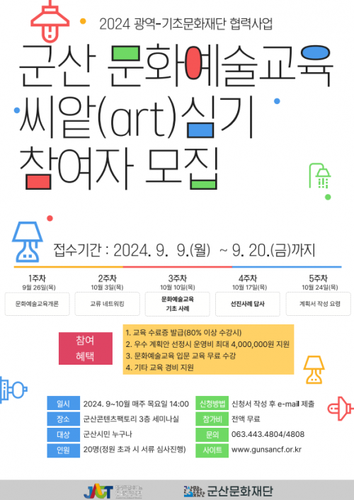 [½Åµ¿¾Æ¹æ¼Û=À̺´½Ä±âÀÚ] ±º»ê¹®È­Àç´Ü(ÀÌ»çÀå °­ÀÓÁØ, ÀÌÇÏ Àç´Ü)ÀÌ ¿À´Â 9¿ù 20ÀÏ(±Ý)±îÁö ¡®2024 ±¤¿ª-±âÃʹ®È­Àç´Ü Çù·Â»ç¾÷ [±º»ê ¹®È­¿¹¼ú±³À° ¾¾-¾Ô(art) ½É±â]¡¯ÀÇ Âü¿©ÀÚ¸¦ ¸ðÁýÇÑ´Ù.