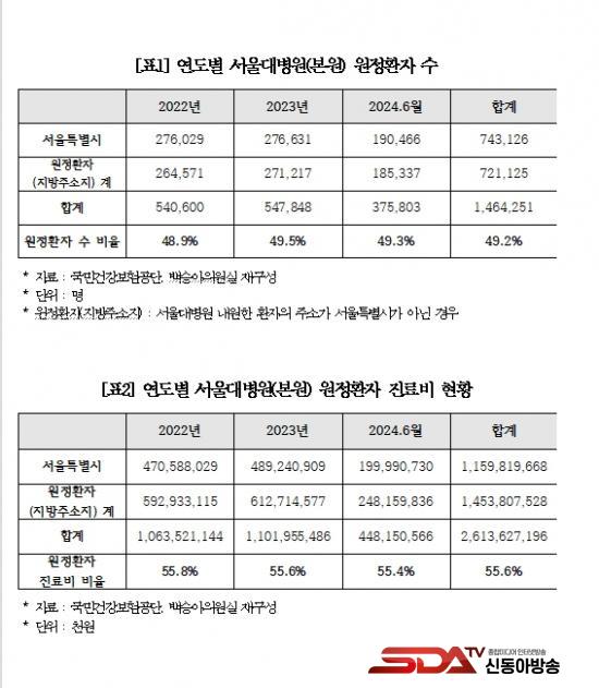 ¼¿ï´ëº´¿øÀÇ Àüü Áø·áºñ 2Á¶ 6,136¾ï¿ø Áß Áö¹æ ¿øÁ¤È¯ÀÚ Áø·áºñ´Â Àý¹Ý ÀÌ»óÀÎ 1Á¶ 4,538¾ï¿ø(55.6%)ÀÎ °ÍÀ¸·Î ³ªÅ¸³µ´Ù. 2022³â 5,929¾ï¿ø¿¡¼ 2023³â 6,127¾ï¿øÀ¸·Î Áõ°¡ÇßÀ¸¸ç ¿ÃÇØ 6¿ù±îÁö 2,481¾ï¿øÀÌ´Ù. ¶ÇÇÑ Áö¿ªº° ¿øÁ¤È¯ÀÚ ºñÀ²Àº °æ±âµµ(23.4%)¿Í ÀÎõ(3.9%)À» Á¦¿ÜÇϰí Ãæ³²(2.9%), °æºÏ(2.5%), °¿ø(2.3%), °æ³²(2.0%) ¼øÀ¸·Î ³ô¾Ò´Ù.