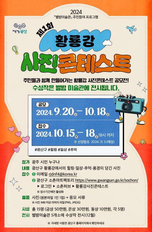 Á¦1ȸ Ȳ·æ° »çÁø ÄÜÅ×½ºÆ®´Â ±¤»ê±¸ Ȳ·æ°¿¡¼ÀÇ ¡âÈú¸µ ¡âÀÏ»ó ¡âÃß¾ï ¡âdz°æÀÌ ´ã±ä »çÁøÀ» ÁÖÁ¦·Î ±¤ÁÖ ½Ã¹Î ´©±¸³ª Âü¿©ÇÒ ¼ö ÀÖ´Ù.