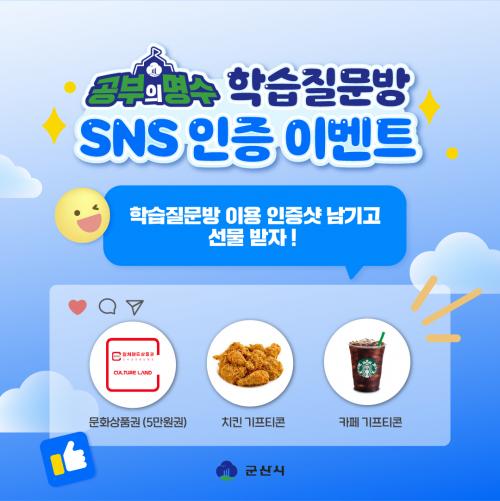 Âü¿© ¹æ¹ýÀº '°øºÎÀÇ ¸í¼ö' ÇнÀÁú¹®¹æÀ» ÀÌ¿ëÇÏ´Â ¸ð½ÀÀ» »çÁøÀ¸·Î Âï¾î °³ÀÎ SNS¿¡ ¿Ã¸° ÈÄ, ±º»ê½Ã ÆäÀ̽ººÏ À̺¥Æ® °Ô½Ã±Û¿¡ Âü¿© ¿Ï·á ´ñ±Û°ú À̺¥Æ® ½Åû¾ç½ÄÀ» ÀÛ¼ºÇØ Á¦ÃâÇÏ¸é µÈ´Ù.