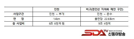 À̹ø Á¦¾È¼¿¡´Â °æÀÎÀüö(¿Â¼ö¿ª~ÀÎõ¿ª, 22.63km) ±¸°£ÀÇ ÁöÇÏÈ ¹æ¾ÈÀ» ´ã°í ÀÖÀ¸¸ç, °æ±âµµ¿Í °øµ¿À¸·Î ÃßÁøµÈ´Ù. ÀÌÁß ÀÎõ½Ã ±¸°£Àº ÀÎõ¿ª¿¡¼ ºÎ°³¿ª±îÁö 14km ±¸°£ÀÌ´Ù. ÃÑ»ç¾÷ºñ´Â ¾à 6Á¶ 6õ¾ï ¿øÀ¸·Î, ÀÌ Áß Ã¶µµ ÁöÇÏÈ¿¡ ¾à 3Á¶ 4õ¾ï ¿ø, »óºÎ ºÎÁö °³¹ß¿¡ ¾à 3Á¶ 2õ¾ï ¿øÀÌ ¼Ò¿äµÉ ¿¹Á¤ÀÌ´Ù.
