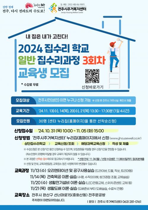 Áý¼ö¸®Çб³´Â °£´ÜÇÑ ½Ç½À À§ÁÖÀÇ Áý¼ö¸®±³À°À» ÅëÇØ ½Ã¹ÎµéÀÌ ½º½º·Î ÁýÀ» °íÃÄ ¾²´Â ¹®È¸¦ È®»ê½Ã۱â À§ÇØ ±âȹµÈ ±³À°ÇÁ·Î±×·¥À¸·Î, ¿ÃÇØ´Â ÀϹÝÁý¼ö¸®°úÁ¤ 2ȸ¿Í ¿å½ÇÁý¼ö¸®°úÁ¤ 1ȸ, ÁÖ¸»Æ¯°°úÁ¤ 2ȸ¿¡ ÀÌ¾î ¸¶Áö¸· ±³À° ÀÏÁ¤ÀÎ ÀϹÝÁý¼ö¸®°úÁ¤ 3ȸÂ÷¸¸ ³²°ÜµÎ°í ÀÖ´Ù.