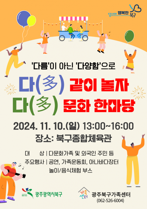 ºÏ±¸°¡Á·¼¾ÅÍ ÁÖ°üÀ¸·Î ¿¸± À̹ø Çà»ç´Â ¡®´Ù¸§ÀÌ ¾Æ´Ñ ´Ù¾çÇÔÀ¸·Î!¡¯¶ó´Â ÁÖÁ¦ ¾Æ·¡ ´Ù¹®È°¡Á¤․¿Ü±¹ÀÎ․Áö¿ª ÁֹΠµî ÃÑ 500¿© ¸íÀÌ Âü¼®ÇÑ °¡¿îµ¥ ¡®±â³ä½Ä¡¯, ¡®¼ÒÅë․ÈÇÕÀÇ À塯 µîÀÌ ¿ÀÈÄ 4½Ã±îÁö ¿î¿µµÉ ¿¹Á¤ÀÌ´Ù.