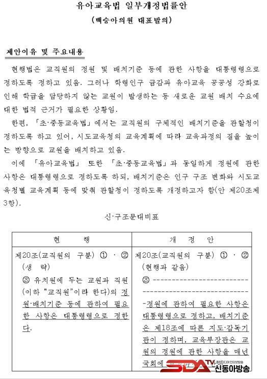 ¡à ±¹È¸ ±³À°À§¿øÈ¸ ¹é½Â¾Æ ÀÇ¿ø(´õºÒ¾î¹ÎÁÖ´ç)ÀÌ ´ëÇ¥ ¹ßÀÇÇÑ ¡¸À¯¾Æ±³À°¹ý °³Á¤¾È¡¹Àº À¯Ä¡¿ø ±³¿ø Á¤¿ø¿¡ °üÇÑ »çÇ×Àº ´ëÅë·É·ÉÀ¸·Î Á¤Ç쵂 ¹èÄ¡±âÁØÀº ½Ãµµ±³À°Ã» µî °üÇÒûÀÌ Á¤Çϰí, ±³À°ºÎ Àå°üÀº Á¤¿ø¿¡ °üÇÑ »çÇ×À» ¸Å³â ±¹È¸¿¡ º¸°íÇϵµ·Ï ÇÏ´Â ³»¿ëÀÌ´Ù.