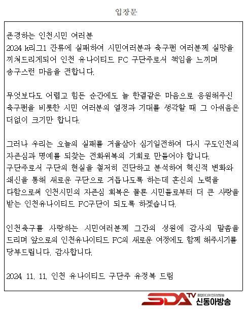 À¯Á¤º¹ ±¸´ÜÁÖ´Â ¡°±×µ¿¾È º¸³»Áֽмº¿ø¿¡ ±íÀÌ °¨»çµå¸®¸ç, ¾ÕÀ¸·Îµµ ÀÎõÀ¯³ªÀÌÆ¼µå FCÀÇ »õ·Î¿î ¿©Á¤À» ÇÔ²²ÇØ Áֽñ⸦ ºÎʵ台´Ù¡±¶ó°í ÀÎõ Ã౸¸¦ »ç¶ûÇÏ´Â ½Ã¹Îµé¿¡°Ô ´çºÎÀÇ ¸»À» ÀüÇß´Ù.