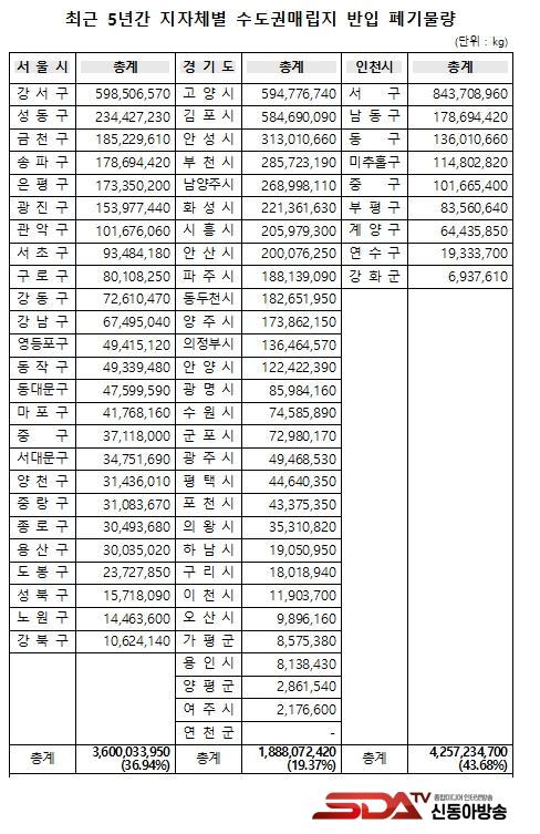 Áö¿ªº°·Î ºÃÀ» ¶§ ¼­¿ï½Ã¿¡¼­´Â °­¼­±¸(59¸¸8õ506t), ¼ºµ¿±¸(23¸¸4õ427t), ±Ýõ±¸(18¸¸5õ229t), ¼ÛÆÄ±¸(17¸¸8õ694t), ÀºÆò±¸(17¸¸8õ694t), ±¤Áø±¸(15¸¸3õ977t), °ü¾Ç±¸(10¸¸1õ676t) µî 7°³ ÀÚÄ¡±¸¿¡¼­ 10¸¸t ³Ñ´Â Æó±â¹°À» ¼öµµ±Ç¸Å¸³Áö·Î º¸³Â´Ù.