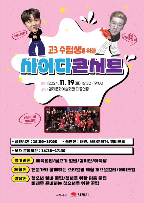 »çÀÌ´Ù ÄܼƮ´Â °í3 ¼öÇè»ýµéÀÇ ºÎ´ã°¨°ú û¼Ò³âµéÀÌ Çо÷¿¡¼ ¿À´Â ½ºÆ®·¹½º ÇØ¼ÒÀÇ ÀåÀ» ¸¶·ÃÇÏ°í °ü³» û¼Ò³â»Ó¸¸ ¾Æ´Ï¶ó ½Ã¹ÎÀÌ ¼öÁØ ³ôÀº ¹®È°ø¿¬À» ¹«·á·Î °ü¶÷ÇÒ ¼ö ÀÖ´Â Çà»ç´Ù.