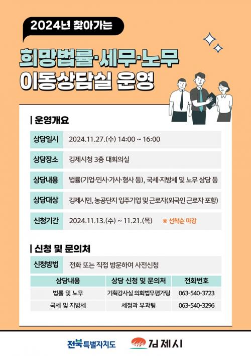 »ó´ãÀ» ¿øÇÏ´Â ½Ã¹Î°ú ±â¾÷Àº ¿À´Â 21ÀϱîÁö »çÀü ½ÅûÇÏ¿©¾ß Çϸç, ¹ý·ü ¹× ³ë¹« »ó´ãÀº ±âȹ°¨»ç½Ç(063-540-3723), ¼¼¹«»ó´ãÀº ¼¼Á¤°ú(063-540-3296)·Î ÀüÈ­Çϰųª Á÷Á¢ ¹æ¹®ÇØ ½ÅûÇÒ ¼ö ÀÖ´Ù.