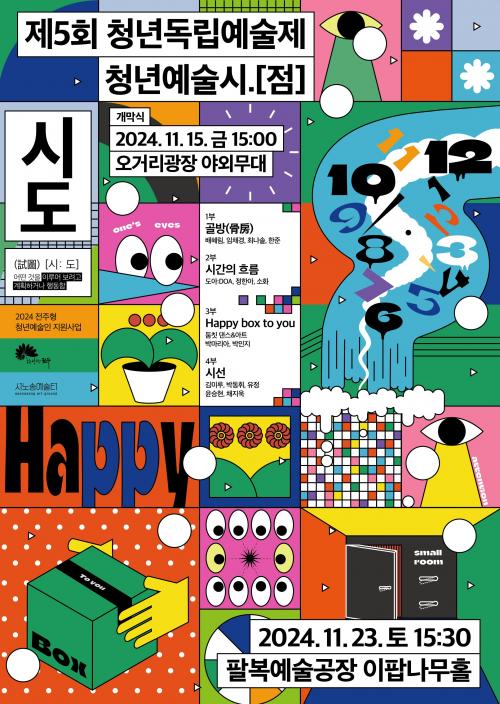 ¿ÃÇØ·Î 5ȸ°¸¦ ¸ÂÀÌÇÏ´Â ¡®Á¦5ȸ û³âµ¶¸³¿¹¼úÁ¦¡¯´Â û³â¿¹¼úÁö¿ø»ç¾÷ÀÇ ¼º°ú¸¦ °øÀ¯ÇÏ´Â ÀÚ¸®·Î ´Ù¾çÇÑ À帣ÀÇ Ã»³â¿¹¼ú°¡µéÀÌ 4±×·ìÀ» ÀÌ·ç¾î ¡â½Ã¼± ¡âHappy box to you ¡â½Ã°£ÀÇ È帧 ¡â°ñ¹æÀ̶ó´Â ¼ÒÁÖÁ¦·Î ²Þ²Ù´Â ÀüÁÖÀÇ ¸ð½À°ú ¿¹¼ú°¡µéÀÇ °í¹ÎÀ» Àü½Ã(°ø¿¬)·Î ¼±º¸ÀÏ ¿¹Á¤ÀÌ´Ù.