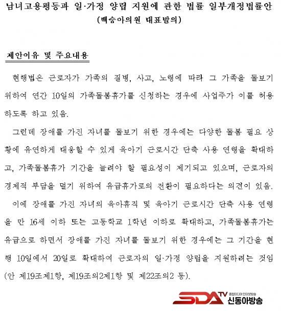 ¡à ´õºÒ¾î¹ÎÁÖ´ç ¹é½Â¾Æ ÀÇ¿ø(±¹È¸ ±³À°À§¿øÈ¸)ÀÌ ´ëÇ¥ ¹ßÀÇÇÑ ¡¸³²³à°í¿ëÆòµî°ú ÀÏ¡¤°¡Á¤ ¾ç¸³ Áö¿ø¿¡ °üÇÑ ¹ý·ü ÀϺΰ³Á¤ ¹ý·ü¾È¡¹¿¡ µû¸£¸é ¡ãÀå¾Ö¸¦ °¡Áø ÀÚ³àÀÇ ºÎ¸ð¿¡ ´ëÇÑ À°¾ÆÈÞÁ÷ ¹× À°¾Æ±â ±Ù·Î½Ã°£ ´ÜÃà »ç¿ë ¿¬·ÉÀ» ÇöÇà Àå¾Ö¿©ºÎ¿Í »ó°ü¾øÀÌ ¸¸ 8¼¼ ÀÌÇÏ ¶Ç´Â ÃʵîÇб³ 2Çгâ ÀÌÇÏ¿¡¼­ ¸¸ 16¼¼ ÀÌÇÏ ¶Ç´Â °íµîÇб³ 1Çгâ ÀÌÇÏ·Î È®´ëÇÏ°í ¡ã°¡Á·µ¹º½ÈÞ°¡ À¯±Þ Àüȯ ¹× ±× ±â°£À» ÇöÇà 10ÀÏ¿¡¼­ 20ÀÏ·Î È®´ëÇÏ´Â ³»¿ëÀÌ´Ù.