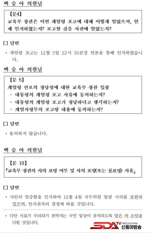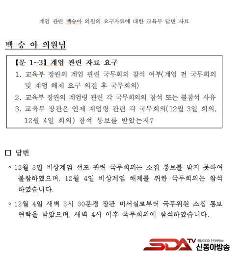 ¡à ±¹È¸ ±³À°À§¿øÈ¸ ¹é½Â¾Æ ÀÇ¿ø(´õºÒ¾î¹ÎÁÖ´ç)ÀÌ °ø°³ÇÑ ¡®±³À°ºÎ Àå°üÀÇ °è¾ö °ü·Ã ±¹¹«È¸ÀÇ Âü¼® ¿©ºÎ¡¯ µîÀ» ¹¯´Â ±³À°ºÎ ¼­¸é´äº¯ ÀÚ·á¿¡ µû¸£¸é, ±³À°ºÎ´Â ¡°12¿ù 3ÀÏ ºñ»ó°è¾ö ¼±Æ÷ °ü·Ã ±¹¹«È¸ÀÇ´Â ¼ÒÁý Å뺸¸¦ ¹ÞÁö ¸øÇÏ¿© ºÒÂüÇÏ¿´À¸¸ç, 12¿ù 4ÀÏ ºñ»ó°è¾ö ÇØÁ¦¸¦ À§ÇÑ ±¹¹«È¸ÀÇ´Â Âü¼®ÇÏ¿´½À´Ï´Ù.¡±, ¡°12¿ù 4ÀÏ »õº® 3½Ã 30ºÐ°æ Àå°ü ºñ¼­½Ç·ÎºÎÅÍ ±¹¹«À§¿ø ¼ÒÁý Å뺸 ¿¬¶ôÀ» ¹Þ¾ÒÀ¸¸ç, »õº® 4½Ã ÀÌÈÄ ±¹¹«È¸ÀÇ¿¡ Âü¼®ÇÏ¿´½À´Ï´Ù.¡±¶ó°í ´äº¯Çß´Ù.