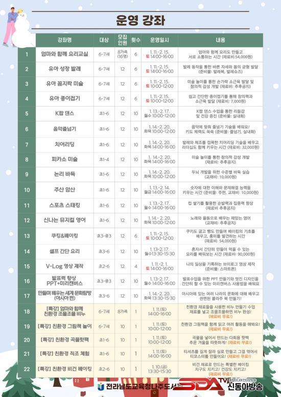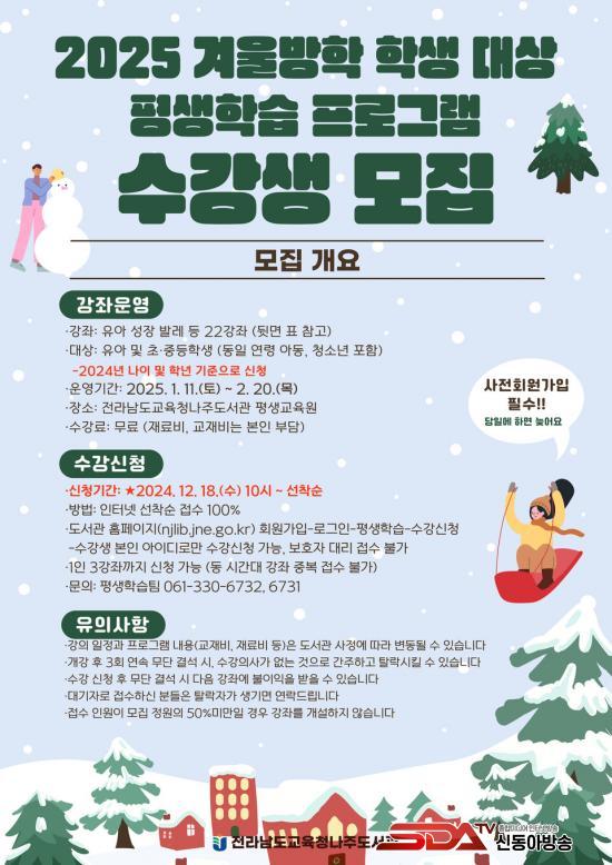 [½Åµ¿¾Æ¹æ¼Û Àü³²³ªÁÖ=À̽ŵ¿±âÀÚ] Àü¶ó³²µµ±³À°Ã»³ªÁÖµµ¼­°üÀº ¿À´Â 12¿ù 18ÀϺÎÅÍ ³ªÁÖ Áö¿ª À¯¾Æ ¹× ÃÊ¡¤ÁßÇлýµéÀ» ´ë»óÀ¸·Î °Ü¿ï¹æÇÐ Çлý ´ë»ó Æò»ýÇнÀ ÇÁ·Î±×·¥ ¼ö°­»ýÀ» ¸ðÁýÇÑ´Ù.