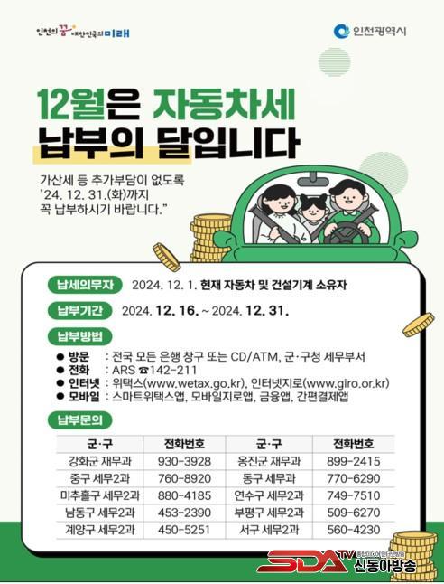 ÀÚµ¿Â÷¼¼ ³³ºÎ ±â°£Àº 12¿ù 16ÀϺÎÅÍ 12¿ù 31ÀϱîÁö´Ù. ÀÚµ¿Â÷¼¼´Â °¡±î¿î ÀºÇàÀ» ¹æ¹®ÇØ ³³ºÎÇÒ ¼ö ÀÖÀ¸¸ç, Áö¹æ¼¼ ³³ºÎ ½Ã½ºÅÛÀÎ À§Åýº(www.wetax.go.kr), ¿Â¶óÀÎ °èÁÂÀÌü, ½º¸¶Æ®Æù ¾Û(½º¸¶Æ® À§Åýº), ¶Ç´Â ÅÚ·¹¹ðÅ·(ARS)À¸·Î °øÈÞÀϰú ¾ß°£¿¡µµ Æí¸®ÇÏ°Ô ³³ºÎÇÒ ¼ö ÀÖ´Ù.