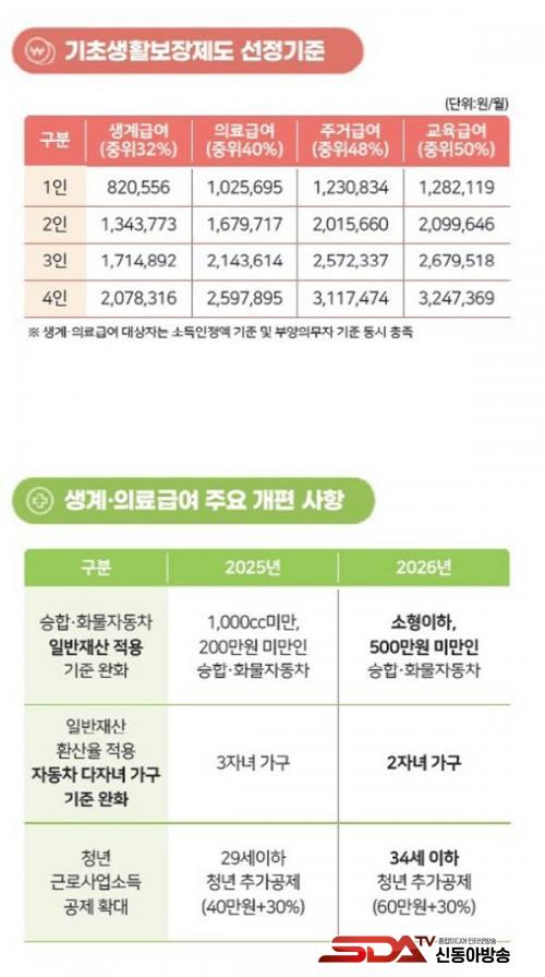 2026³â 1ÀÎ °¡±¸ÀÇ ÁßÀ§¼ÒµæÀº 2025³â 239¸¸ 2013¿ø ´ëºñ 7.20% ÀλóµÈ 256¸¸ 4238¿øÀ¸·Î ±âÃÊ»ýȰº¸Àå ¼ö±Þ °¡±¸ÀÇ ´ë´Ù¼ö¸¦ Â÷ÁöÇÏ´Â 1ÀÎ °¡±¸ ´ë»ó¿¡´Â º¸´Ù ³ôÀº Àλó·üÀÌ Àû¿ëµÆÀ¸¸ç, »ý°è±Þ¿© ¼±Á¤±âÁØÀº 1ÀÎ °¡±¸ 5¸¸ 5000¿ø, 4ÀÎ °¡±¸ 12¸¸ 7000¿ø ÀλóµÅ »ýȰ ¼öÁØÀÌ Çâ»óµÉ °ÍÀ¸·Î ±â´ëµÈ´Ù.