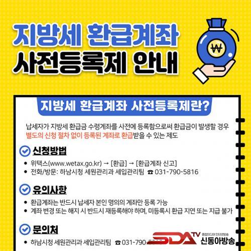 Áö¹æ¼¼ ȯ±Þ°èÁ »çÀüµî·ÏÀº À§Åýº(www.wetax.go.kr) ȨÆäÀÌÁö ¶Ç´Â ¸ð¹ÙÀÏ ¾ÛÀ» ÅëÇØ ½ÅûÇÒ ¼ö ÀÖÀ¸¸ç, Çϳ²½Ãû ¼¼¿ø°ü¸®°ú ¼¼ÀÔ°ü¸®ÆÀÀ» ¹æ¹®Çϰųª ÀüÈ­(031-790-5816)·Îµµ ½ÅûÇÒ ¼ö ÀÖ´Ù. ȯ±Þ°èÁ´ ³³¼¼ÀÚ º»ÀÎ ¸íÀÇ °èÁ¸¸ µî·Ï °¡´ÉÇϸç, °èÁ º¯°æ ¶Ç´Â ÇØÁö ½Ã¿¡´Â ¹Ýµå½Ã Àçµî·ÏÇØ¾ß ÇÑ´Ù.